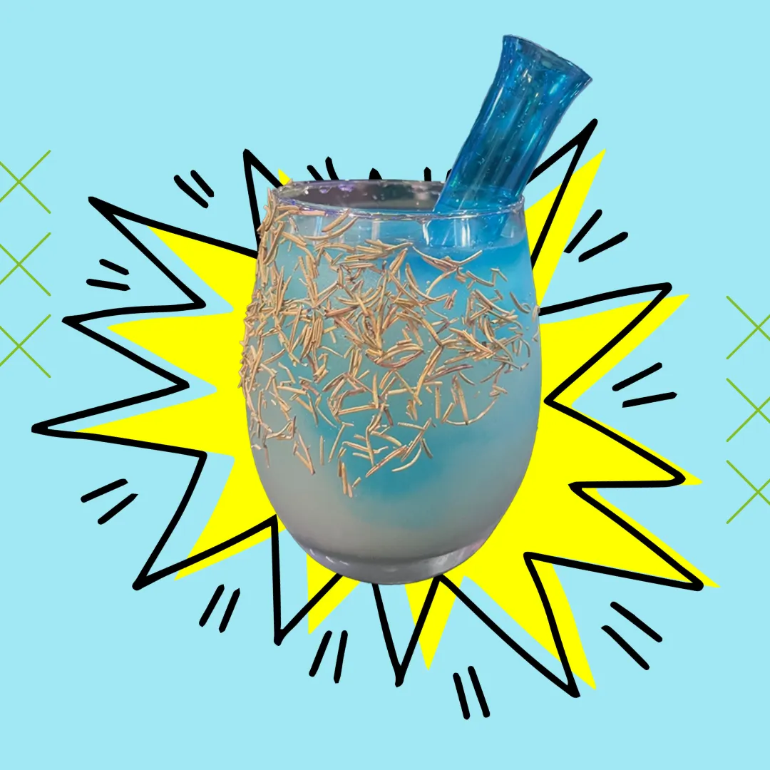 White Jimador, Blue Curaçao, Passion Fruit, syrup and rosemary, tatemado.