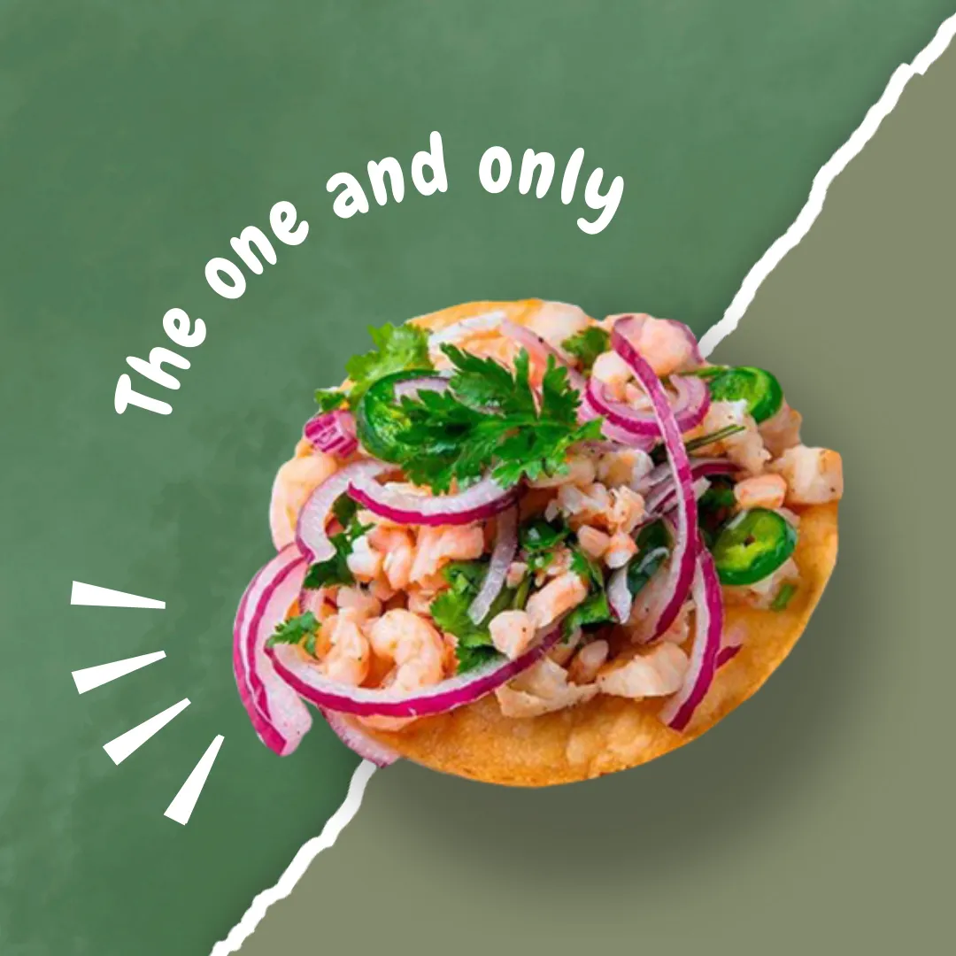 A crispy tostada topped with shrimp ceviche, pico de gallo, and avocado.