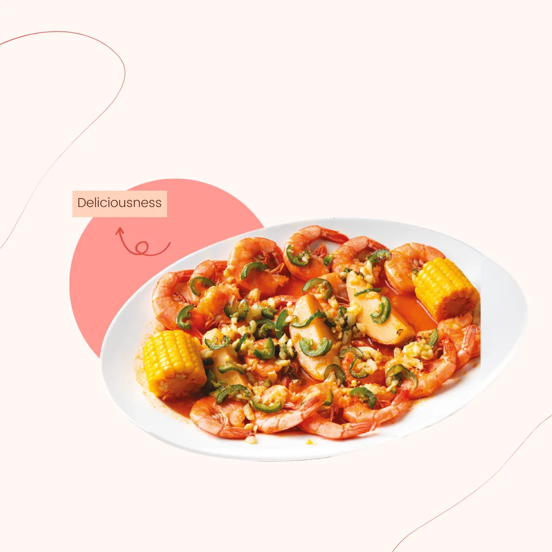 Served with boiled shrimp, garlic butter, corn, potatoes and jalapeños.
